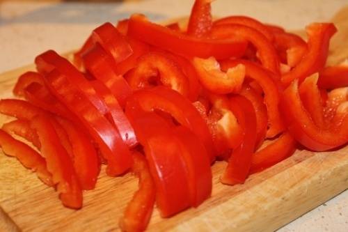 - Papriky důkladně umyjeme, rozkrojíme na polovinu, vybereme semínka a odstraníme přepážky. Nakrájejte papriky na proužky a přidejte do nádoby.