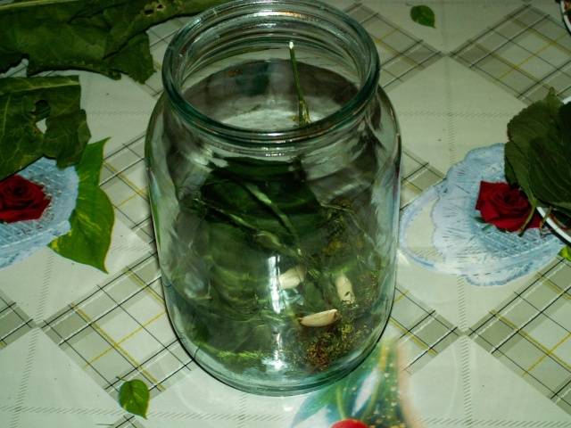- Vložte listy petrželky, kopru, černého rybízu a polovinu česneku uvedené v receptu do sterilních nádob.