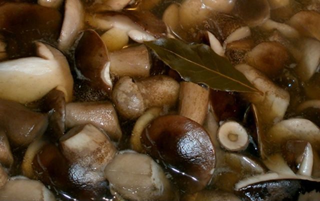 - Samostatně vařte solanku z vody, přidejte sůl. Houby namočte do vroucí směsi a vařte další půl hodiny. Před vypnutím přidejte bobkové listy několik minut.