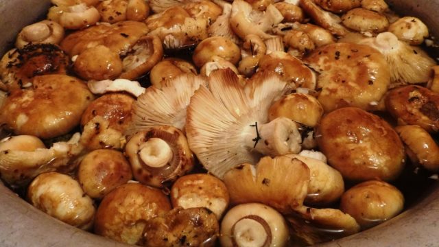 - Ponořte valui do houbové marinády, držte ji ve vroucí směsi po dobu čtvrt hodiny a okamžitě ji rozdělte mezi nádoby pro skladování.