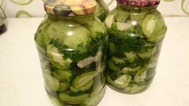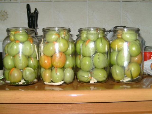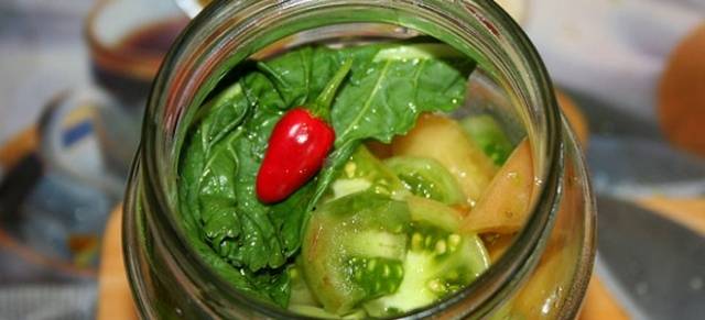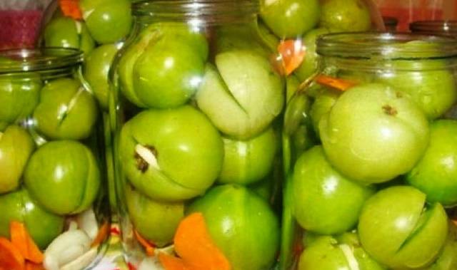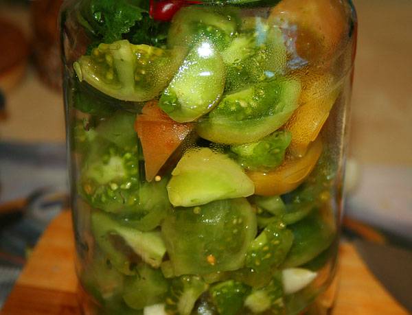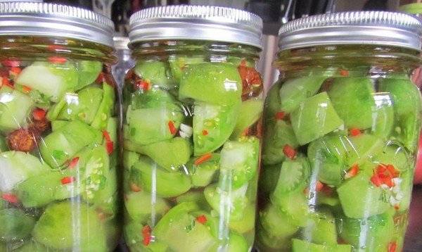 Pikantní občerstvení můžete získat přidáním česneku a feferonek. K moření se používá solanka, která zahrnuje vodu, krystalový cukr a kuchyňskou sůl. ale Zelená rajčata nakládané ve vlastní šťávě, olivovém oleji a adjika. Do prázdných míst můžete přidat mrkev, papriku, ořechy a koření.