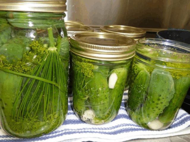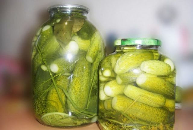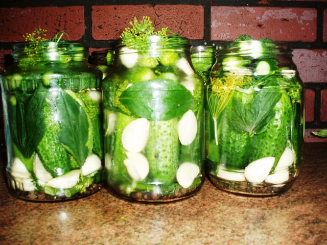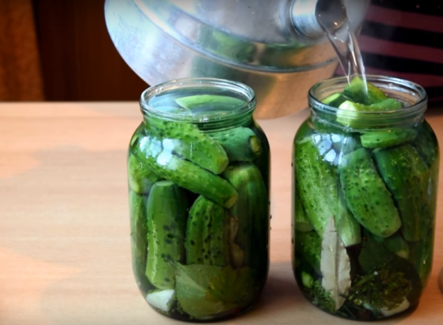 Poté se okurky znovu vloží do sterilních nádob, zalijí se horkou solankou a do nádoby se přidá trochu octa - 1 malá lžička na 3 litrovou nádobu. Nádoba je uzavřena a nastavena na vychladnutí.
