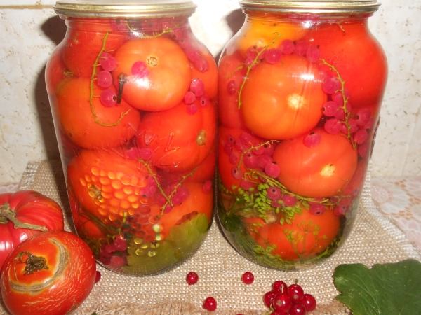 Rajčata s červeným rybízem můžete srolovat bez použití octa, protože samotný rybíz je dobrým konzervačním prostředkem.Ke konzervování je vhodný čerstvý i mražený rybíz.