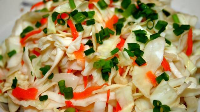 - Oloupejte a mrkví potřete na hrubém struhadle nebo nakrájejte na tenké plátky. Smíchejte se zelím.