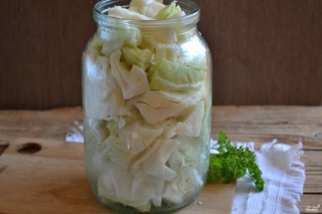 - Zeleninová směs se nalije horkou marinádou a utlačuje se. V této formě by měl obrobek stát jeden den. Poté můžete dát zelí do sklenic a srolovat.
