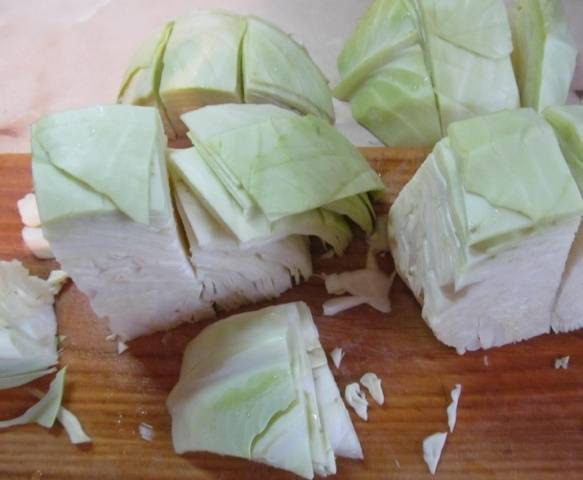 - Oloupejte a nakrájejte zelí na velké čtverce nebo obdélníky, přibližná velikost kousků je 3x3 cm.