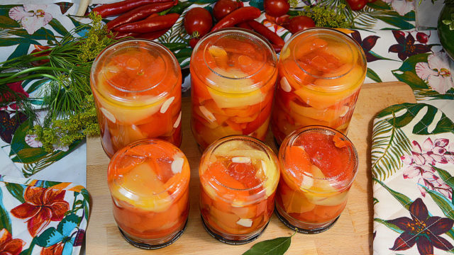 Sladká paprika v pikantní marinádě osloví všechny milovníky kořeněných pokrmů. Takové kořeněné a mírně štiplavé předkrm bude skvělým doplňkem jak pro každodenní, tak pro slavnostní stoly.