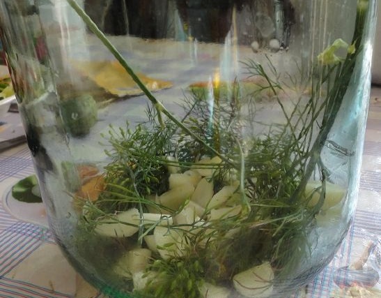 - Na dno dejte bylinky a česnek, nahoře okurky. Nalijte bobule.