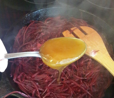 - Řepa se strouhá na korejskou mrkev a posílá se na pánev s horkým rostlinným olejem, kde se za pravidelného míchání asi 15 minut smaží.