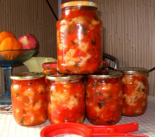 Konzervovaný květák se v zimě používá jako občerstvení hlavního jídla. Vaří se v kombinaci s mrkví, brokolicí a jinou zeleninou. V závislosti na souboru výchozích složek se získávají sladší přípravky s řepou a paprikou nebo horké občerstvení s chilli a kořením. Banky pro polotovary pro zimní skladování jsou sterilizovány.