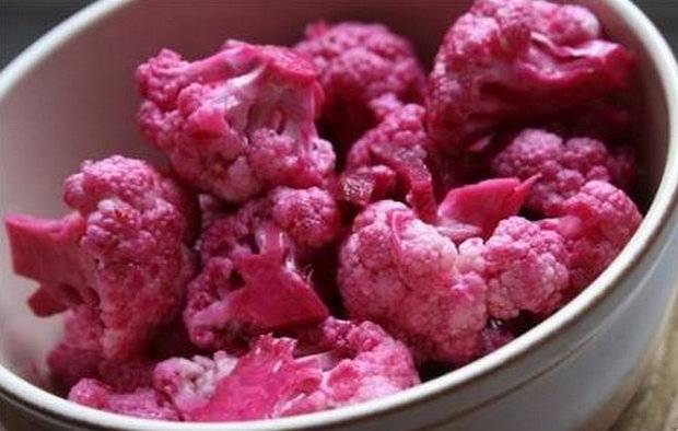 Pokud se v receptu objeví řepa, získají obrobky bohatou barvu a nasládlou chuť. Jak nakládat květák s řepou, můžete se naučit z následujícího receptu: