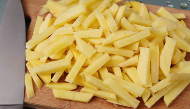 - Brambory oloupejte, nakrájejte na kostky nebo proužky, přidejte je do vývaru.