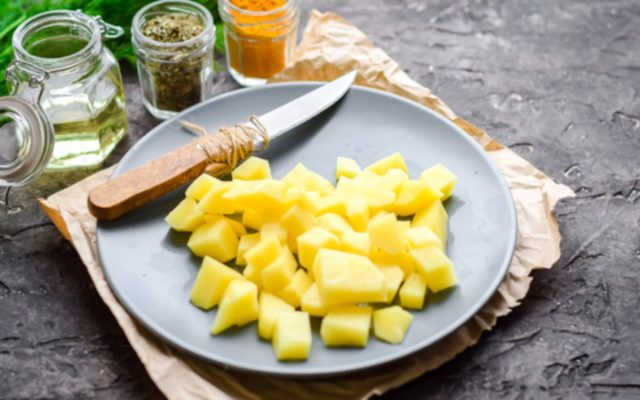- Oloupejte brambory, nakrájejte, přidejte do nádoby na sporáku.