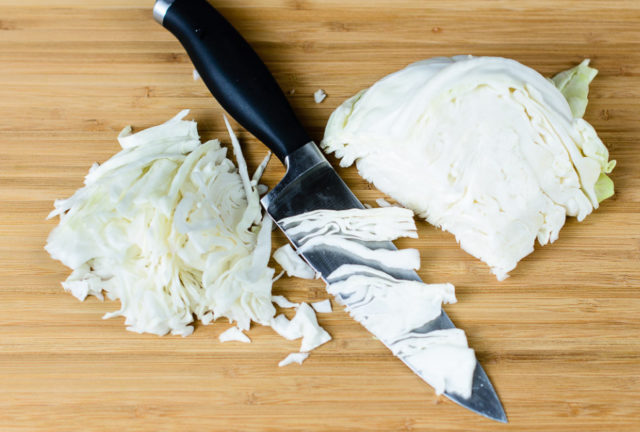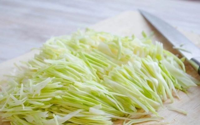 - Nakrájejte zelí, přidejte do zelné polévky, vařte 5 minut.