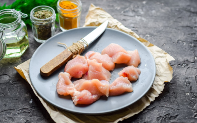 - Nakrájejte kuřecí řízek a vložte ho do hrnce.