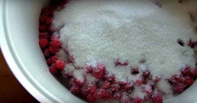 - Rozmrazené maliny se přenesou do umyvadla a pokryjí se cukrem.
