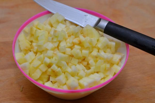 - Jablka jsou oloupaná, lusky semen a nakrájená na malé kostky.