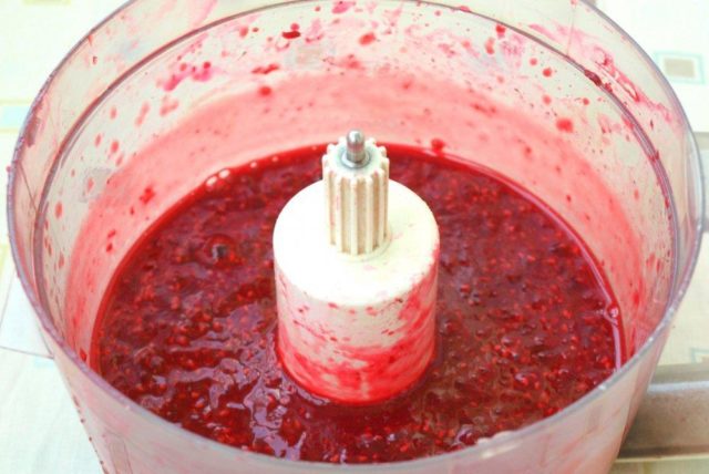 - Maliny s cukrem se také promění v homogenní hmotu. Suroviny rozdrťte paličkou nebo rozemlejte mixérem.