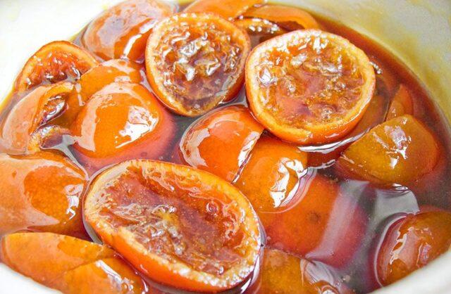 - Umyté citrusové plody jsou na několika místech propíchnuty párátky a ošetřeny ve vroucí vodě po dobu 15 minut.