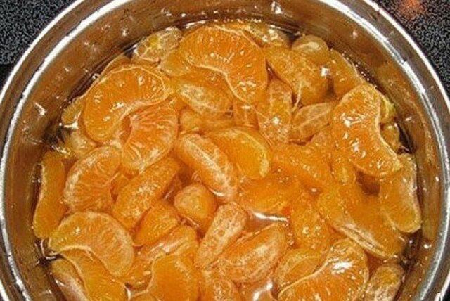 - Připravte cukrový sirup a vložte do něj kousky mandarinky.