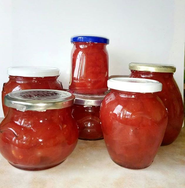 - Poté je hotový výrobek položen do připravených, sterilizovaných nádob a srolován víčky.
