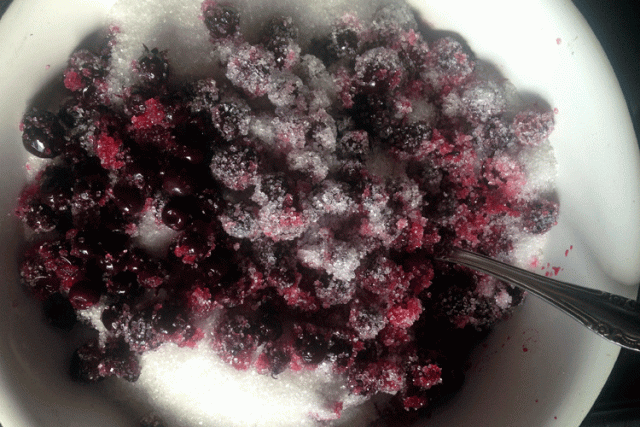 - Rozložte bobule společně s cukrem ve vrstvách do misky na vaření a nechte několik hodin nebo přes noc působit, aby se objevila šťáva.
