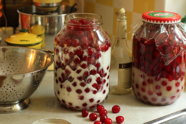 - Oloupané bobule jsou rozloženy do skleněné nádoby a pokryty cukrem. Z výše uvedeného se surovina nalije vodkou.