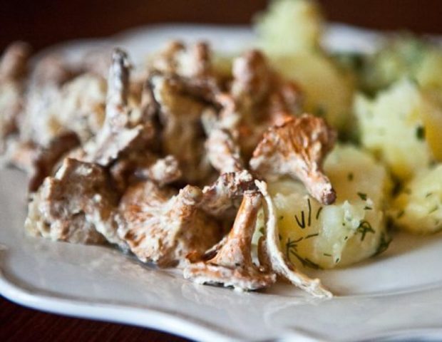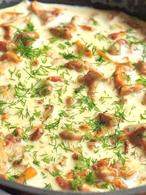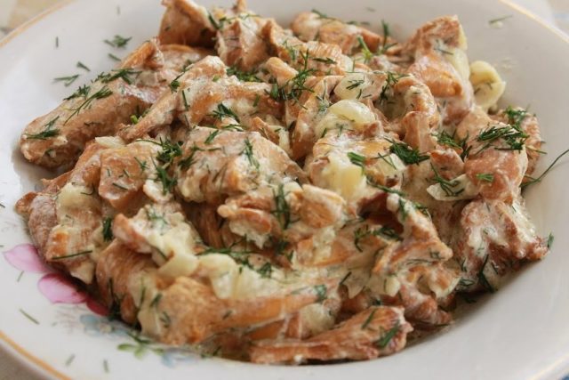 K houbám se obvykle přidává zakysaná smetana nebo smetana, aby se během smažení dodala zvláštní něha. V tomto receptu se navrhuje vařit smažené lišky s cibulí a majonézou, jídlo se ukáže jako jemné a šťavnaté.