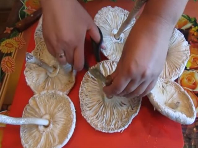 Po pečlivém zpracování horní části houby musíte prozkoumat její vnitřek. Desky víčka by měly být čisté, bílé. Noha musí být odstraněna a čepice, pokud má průměr větší než 20 cm, se rozřízne na dvě části.