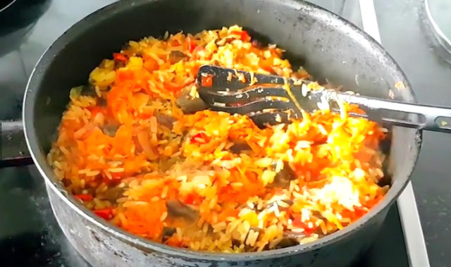 - Opláchněte rýži a nalijte na brambory. Vypněte oheň na minimum. Vařte se zavřeným víkem po dobu 25 minut.