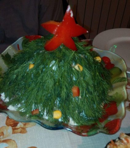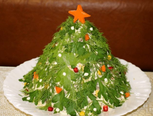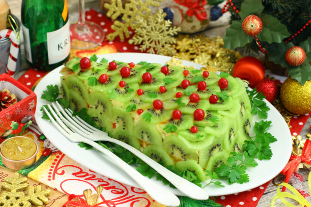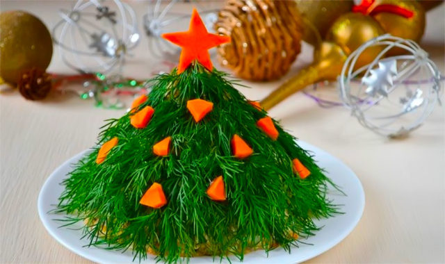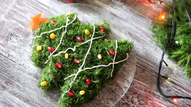 Svislá rybí kost vypadá působivěji, ale poměrně obtížně se připravuje. Je třeba dbát na to, aby se nerozpadl. Role dekorací na něm hrají malé kousky zeleniny, improvizovaný věnec z majonézy a funkce vánočních koulí leží na různých bobulích nebo semenech granátového jablka.