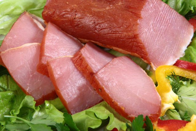 - Šunka je nakrájena na tenké podlouhlé proužky.