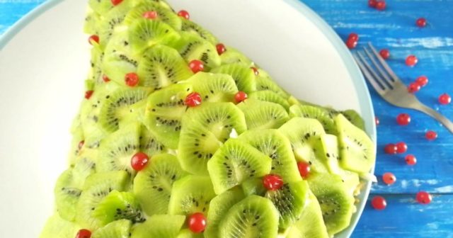 - Plátky kiwi jsou úhledně rozloženy nahoře. Semena granátového jablka se používají jako dekorace.