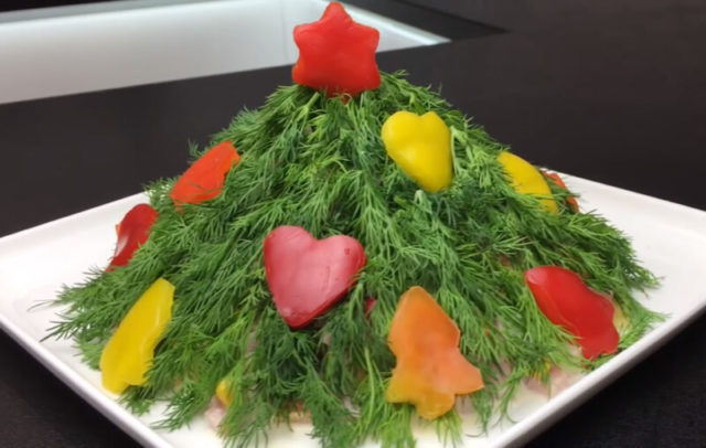 - Výsledná směs se opatrně rozloží na rovnou desku se sklíčkem. Hvězda z mrkve nebo okurky je nahoře připevněna párátkem.