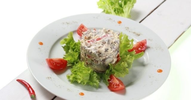 Oblíbený salát s kuřecím masem a houbami je jednou z nejchutnějších variací receptu na předkrm.