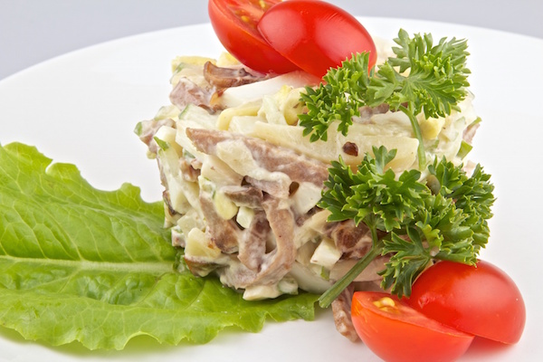 Oblíbený masový salát je velmi chutný a aromatický. Může se podávat jak v běžné pracovní dny, tak při jakékoli příležitosti.