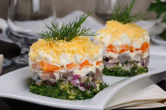 Předkrm připravený podle klasického receptu se ukázal jako velmi bohatý a chuťově uspokojivý. Dekorace vám umožní připravit pamlsky jako jedno z nejpozoruhodnějších pokrmů na slavnostním stole.