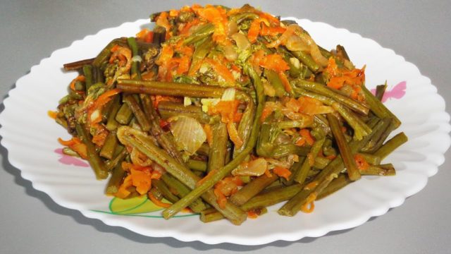 Mrkev se strouhá na hrubém struhadle a smaží se spolu s kapradí na oleji na vysokém ohni, dokud se na zelenině neobjeví lehká kůra. Poté přidejte nasekaný česnek, dobře promíchejte a duste dalších 15 minut. Přidejte červenou papriku a sůl podle chuti.