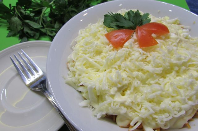 - Všechny zpracované přísady jsou rozloženy na široký talíř ve vrstvách v tomto pořadí: brambory, omáčka, cibule, kuřecí maso, omáčka, bílé a žloutky, sýr, omáčka, zelí.