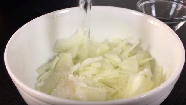 Všechny přísady pro výrobu marinády se smíchají a zalijí horkou vodou. Cibule nakrájená na malé půlkruhy se ponoří do kapaliny po dobu nejméně 30 minut. Poté se voda vypustí pomocí cedníku. Cibule se nechá několik minut zaschnout.