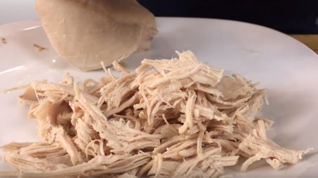 - Vařte kuřecí prsa do měkka. Po ochlazení je jemně rozřezán nebo ručně pečlivě rozdělen na vlákna.