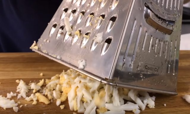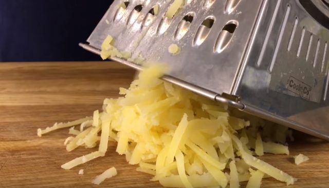 - Neloupané brambory a vejce se vaří, pak se strouhají na hrubém struhadle.