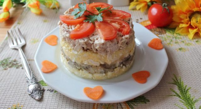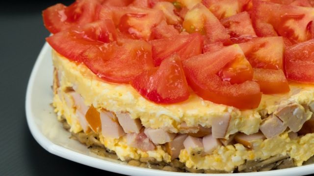 Další stejně chutnou možností je recept na salát milovaného manžela s uzenými prsy a tvrdým sýrem. Jídlo zahrnuje také houby - můžete použít lesní houby, žampiony nebo hlívy ústřičné. Je třeba si uvědomit, že obyčejné houby musí být před smažením vařeny. Místo běžného talíře se doporučuje použít formu z děleného železa.