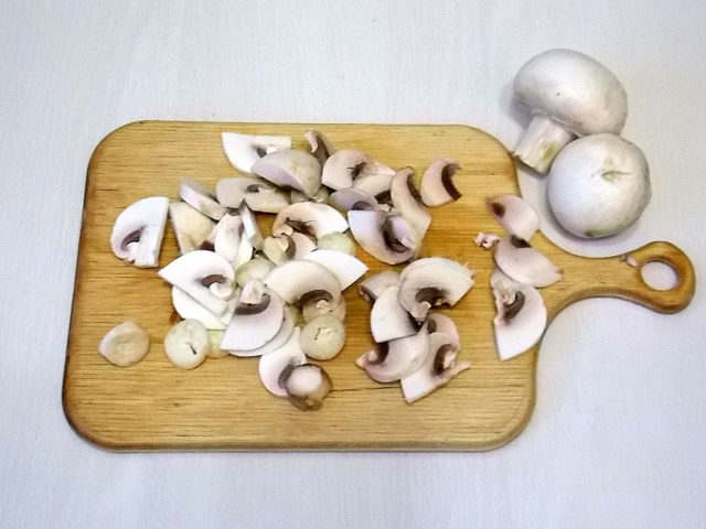 - Oloupejte a nadrobno nakrájejte cibuli a houby. Na pánvi s ohřátým olejem se hmota smaží po dobu 5 minut, solí a ochladí.