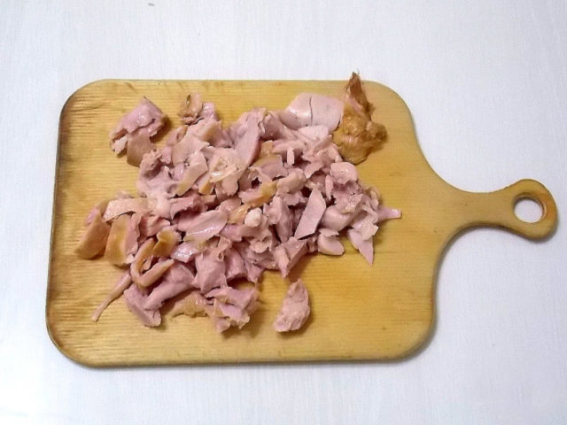 - Uzené maso je oloupané, oloupané a nakrájené na malé kostky.