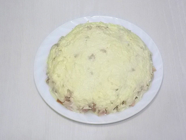 - Všechny komponenty jsou položeny na sebe v tomto pořadí: houby, vejce se sýrem, kuřecí maso a znovu vejce se sýrem.