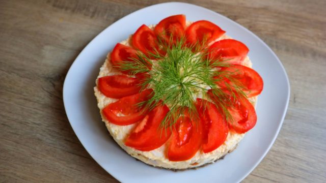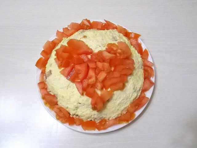 - Poté, co salát trochu stojí v chladničce, můžete začít zdobit. Rajčata jsou nakrájena na plátky a rozložena v náhodném pořadí: mohou zcela nebo částečně zakrýt povrch salátu.