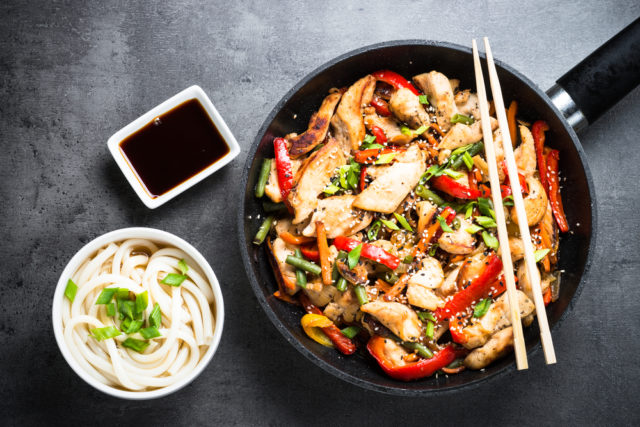 Hlívy ústřičné se během vaření smaží - musí být nahrubo nasekané. Kuřecí prsa by měla být očištěna od filmu, žil, kostí. Oddělte malé zaoblení od velkého. Vše je obvykle nakrájeno na tenké proužky.