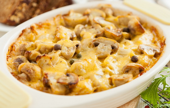Ve zakysané smetaně nebo smetaně mají houby s kuřecím masem obzvláště jemnou chuť. Častěji se sýr třese nahoře a roztírá se na zbytek ingrediencí. Když je upečený, dostanete sýrovou „hlavu“ a výrobky pod ním se budou péct lépe.