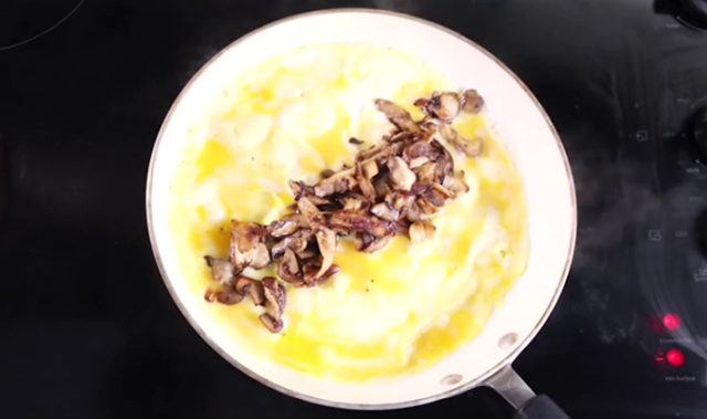 - Nalijte obsah pánve výslednou směsí vejce a zakysané smetany a snižte teplotu a smažte na středním ohni, dokud nebude měkká.